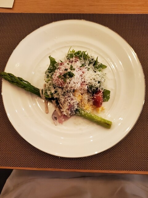 シナノユキマス、長野県産アスパラガスとハモンセラーノのサラダ