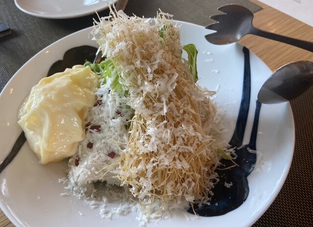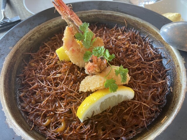 パリパリの麺の下は柔らかいマカロニのようなパスタが。パスタのパエリアは初めてでしたが、海老の香りで溢れたお料理でとても美味しかったです。