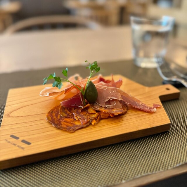 チョリソと生ハムしょっぱいものだけ出てくるので次のサラダまで取っておく。