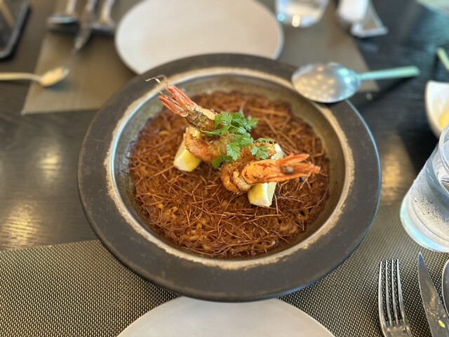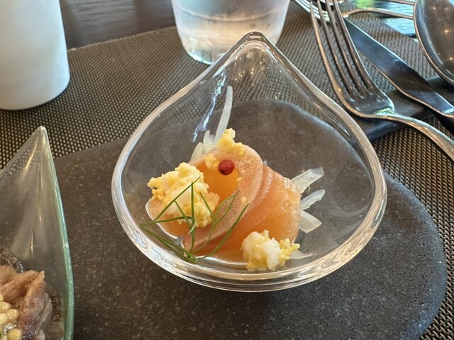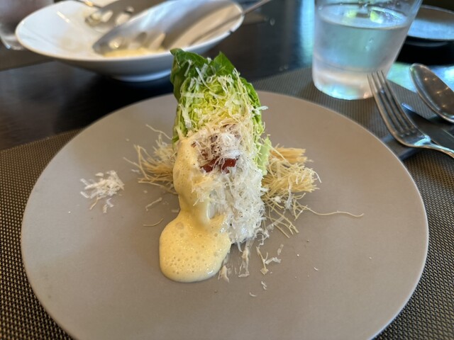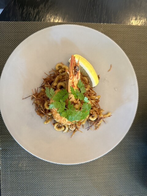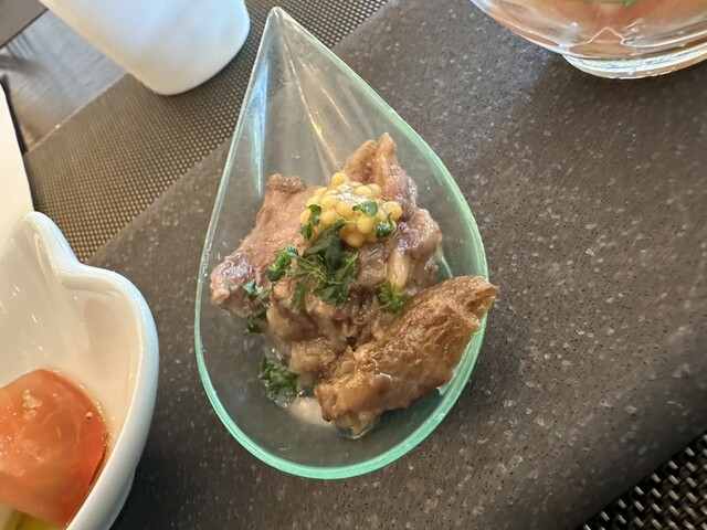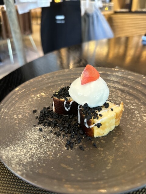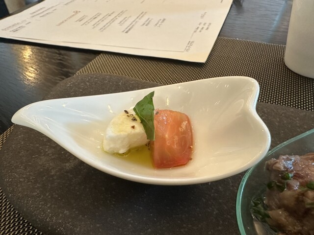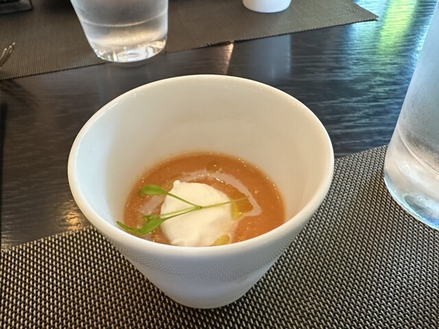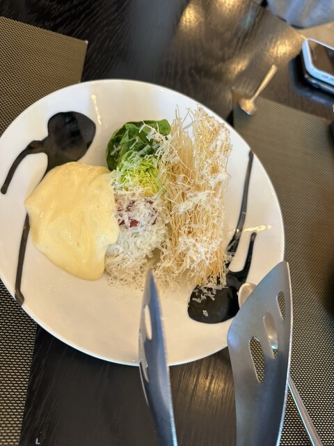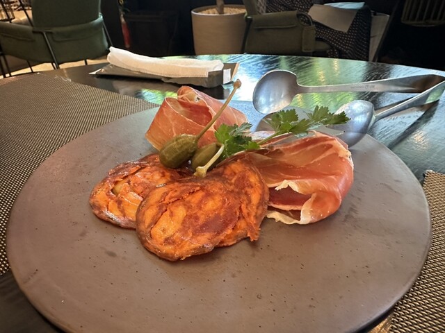 駅から旧軽に向かう途中に見えるスタイリッシュなホテルに入っています。ピンチョス3種類はトマトとチーズのカプレーゼ、牛すじ煮込み、サーモンと玉ねぎのマリネをいただき、スープにはトマトの冷製スープをいただきました。シンプルだけど岩塩が効いたカプレーゼ、牛すじとマリネのバランスがとてもよかったです。冷静スープに入っている部分はココナッツ風味で甘く、オリーブオイルとトマトとよく合うお味でした。生ハムとサラミは塩味がちょうどよく、からすぎないお味で、すごく美味しかったです!リトルジェムレタスのサラダはカニミソとパスタの揚げたもの、チーズと自家製マヨネーズが素晴らしいハーモニーで、さまざまな食感が楽しめ、食べていて楽しかったです。スフレトルティーヤはふわふわの卵白の下に卵、玉ねぎ、ベーコン、ジャガイモの入ったオムレツが入っていて、優しい味付けですごく美味しかったです。デザートはバスクチーズケーキでした!チーズの味は濃厚なのに重くなかったので、普段食べない主人も食べきれるほどでした!全体的に味付けが濃すぎず、食材の自然な旨み、塩味、甘みを生かした味付けでとても食べやすかったです。またぜひ伺いたいと思います。