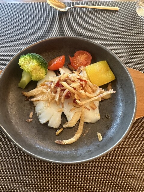 鉄板で提供。魚介の旨みがありフライとの食感が良かったです。付け添えの野菜は、パプリカ、トマト、ブロッコリー。