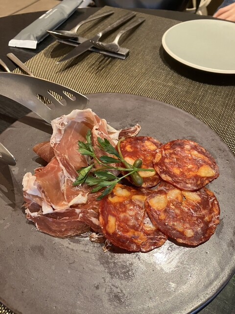 、ピンチョス3種盛り合わせ、ハモンセラーノ&チョリソー、リトルジェムレタスのサラダ、スフレトルティージャ