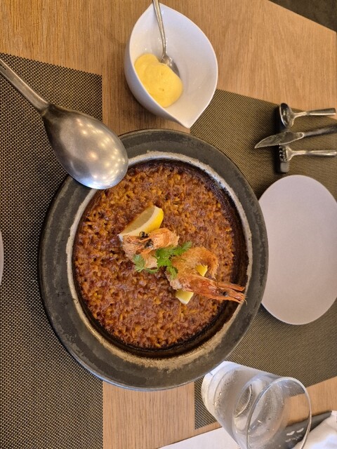 次はスフレトルティージャ。そのルックスに先ずはハッとさせられます。フワッフワッのメレンゲの中はこれまたフワッフワッの黄身が。淡白ながらも味はしっかり。スッーと旨味が口どけしていきます。素晴らしい逸品です。そしてイベリコ豚ローストとハモン・セラーノ。豚のローストはしっとり柔らかく絶妙の火入れで旨味が閉じ込められてます。そしていよいよ濃厚海老出汁のパエリアが登場。海老そのものは米とにこまず、有頭のフライにしてあり、これもフワッフワッ自家製マヨネーズが添えられます。なのでお米は出汁のみで炊かれていてアルデンテに仕上げてます。