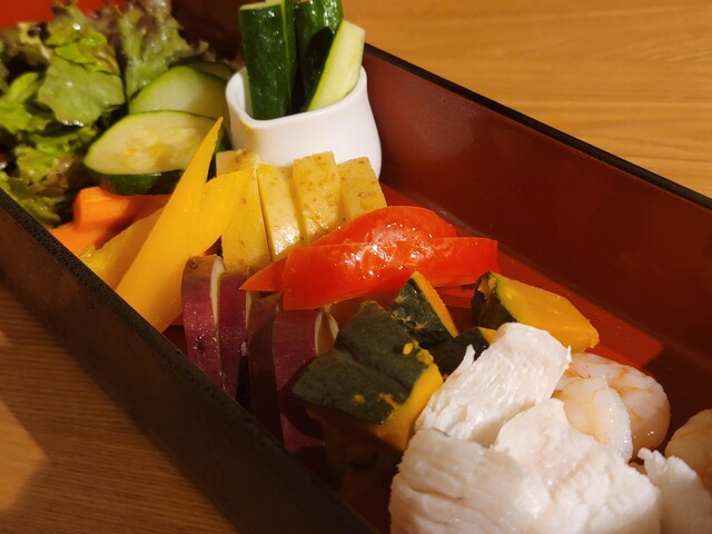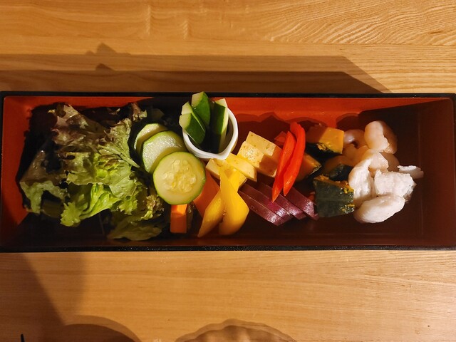 - 居酒屋さんでこの素晴らしきバーニャカウダクオリティは、感動の一品でした。具材は、レタス、ズッキーニ、人参、キュウリ、ジャガイモ、サツマイモ、パプリカ、かぼちゃの野菜類に加えて、ボイル海老、はも!?素敵すぎるラインナップ。そして、アンチョビの効いた独特なソースがとにかく濃厚で美味しい。さらに素敵なのが火。バーニャカウダソースを温める火って、結構序盤に消えることありませんか?今回のソースの火、お皿を下げてもらうまでかなりの時間、火がずーっとついていたので、最後まで熱々ソースにつけて頂くことができました。最初から最後まで、変わることのない美味しい状態で頂けたことに感動です。