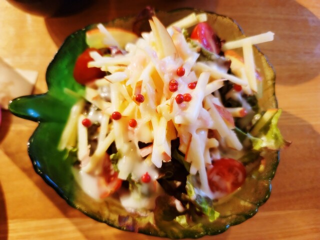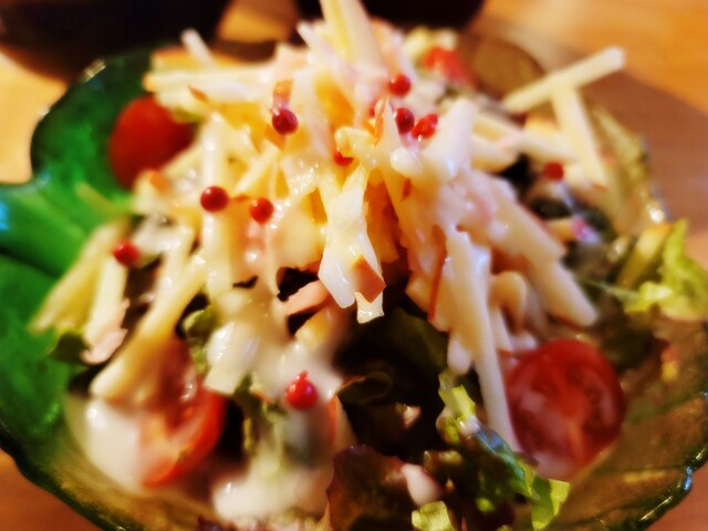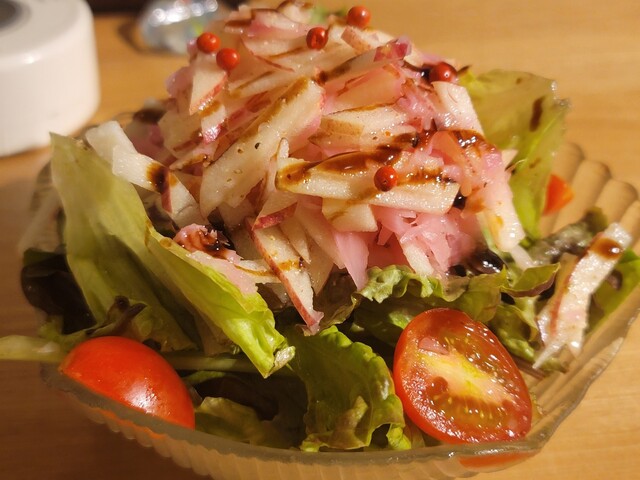 - バルサミコ酢のような味わい。酸味と甘みと野菜のフレッシュさが絶妙にマッチ。ちょっとサラダを食べたいんですよ~、というときに丁度よいサイズ感も見逃せません。これからこってり居酒屋飯を頂く前の健康食としての役割と美味しいの役割を担った素敵サラダです。