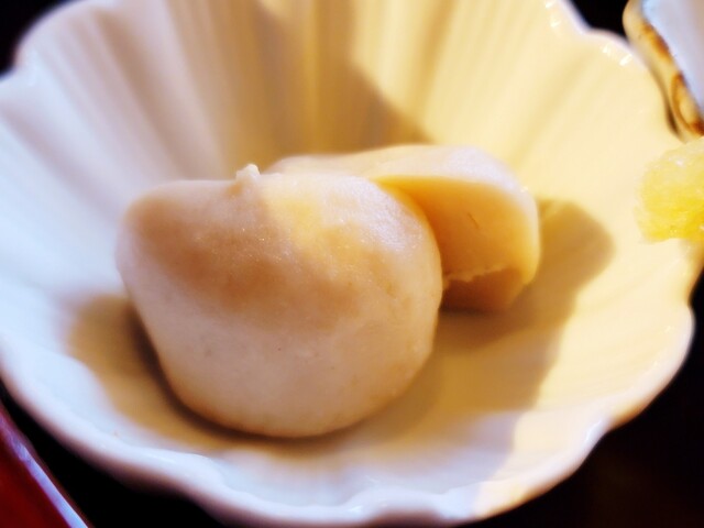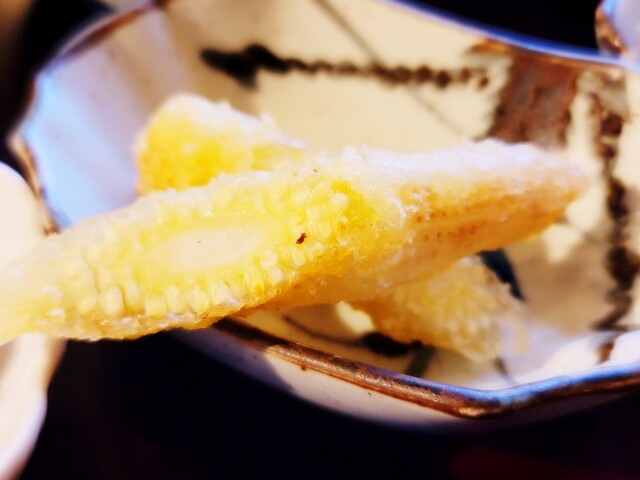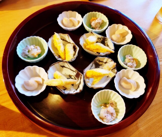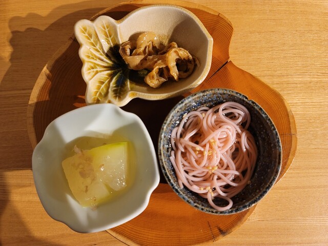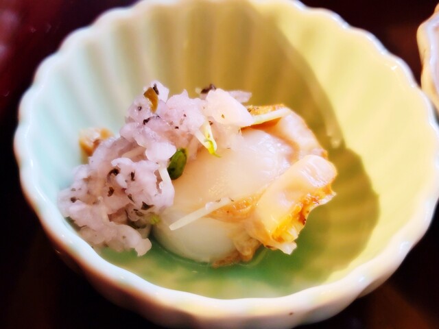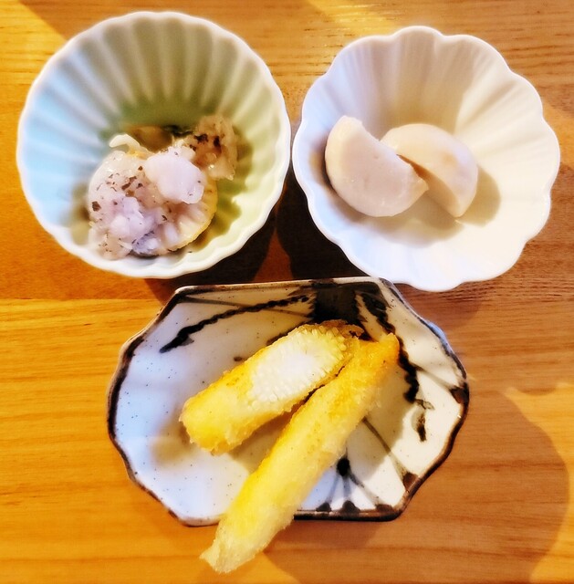 - かいひも、冬瓜、ソーメンの3点セットでした。こちらは日によって変わりそうで楽しみがありますね。先付として濃すぎず薄すぎずなので、最初のビールと共に流し込むには素敵な一品です。