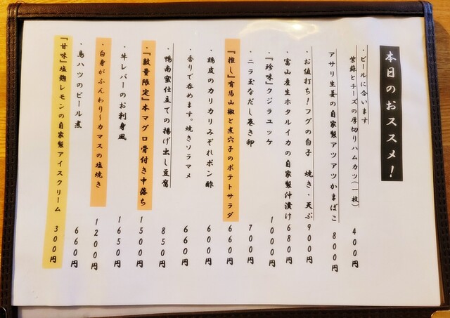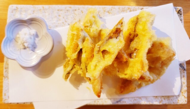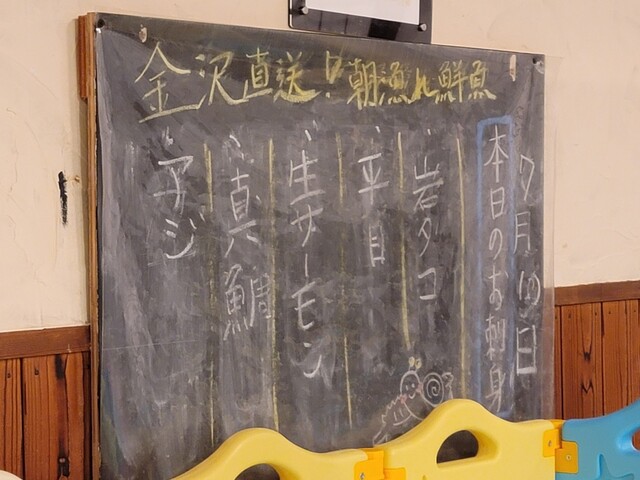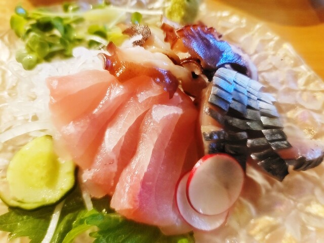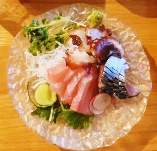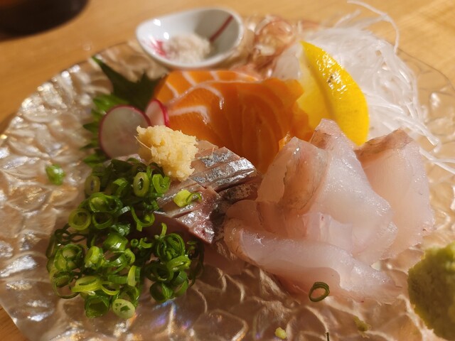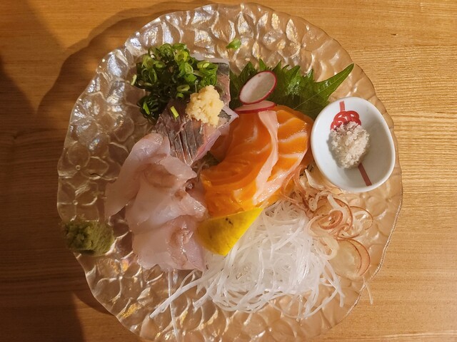 - 金沢直送の朝漁れ鮮魚のようで、毎日、ネタが変わるようです。黒板に「本日のお刺身」として書かれた5種の中から3種(平目、生サーモン、アジ)を選んで注文。本日はその3点以外にも岩だこ、真鯛がありました。5種盛のメニューもあります。1人前で4枚ずつくらいの量が提供されるので、2人でも十分頂けますし、1人でたっぷりと生魚を愉しむことも可能です。