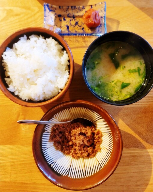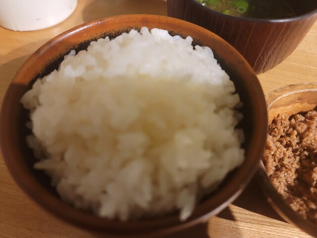- 島唐辛子のピリ辛餃子のお供に頼んだご飯セット。これがまた素晴らしいんです。熱々お味噌汁、固めの好み白米。そして、おかか系の自家製ふりかけ。たった350円で満足度抜群の和食。特に自家製ふりかけは、それとご飯だけで十分なほどに美味しく、量もしっかり頂けます。白飯を餃子で食べるか、自家製ふりかけで食べるか、迷ってしまう程のキラーメニューでした。