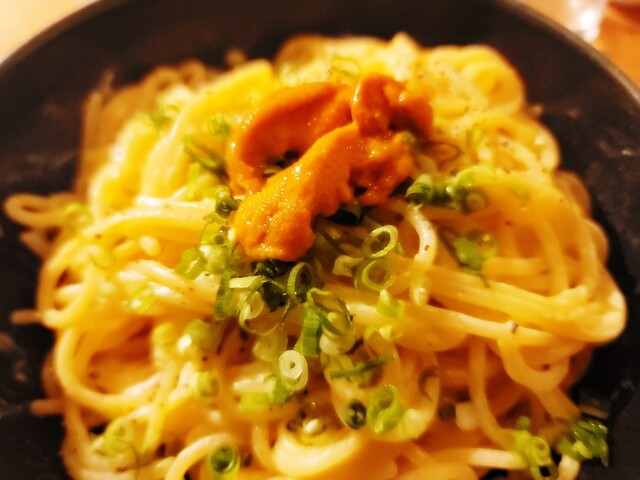 ・〆は「八幡屋磯五郎のピリ辛焼きおにぎり(300円)」と「ウニパスタ(1,210円)」。どちらも安定のお味。