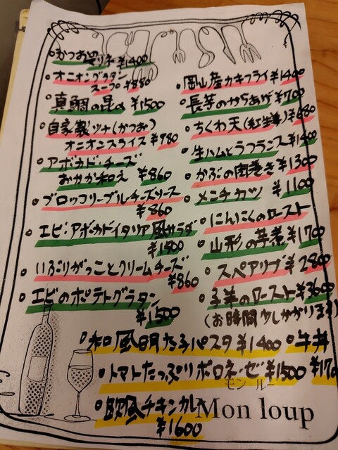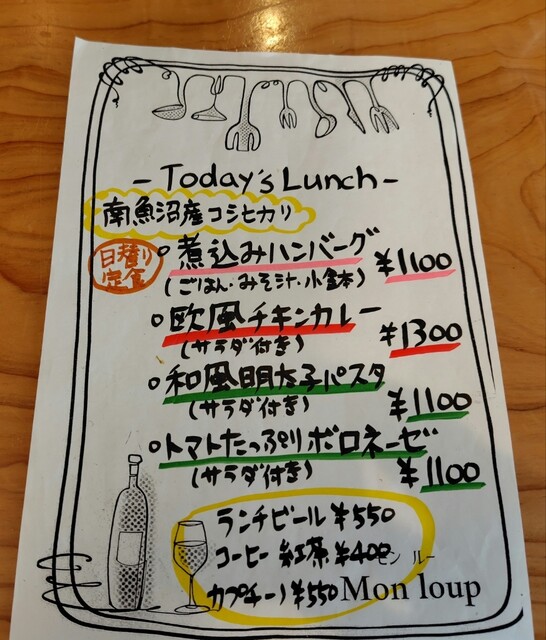 ランチは日替わり定食(料金変動)、欧風チキンカレー@1300、和風明太子パスタ@1100、トマトたっぷりボロネーゼ@1100の4パターンです。