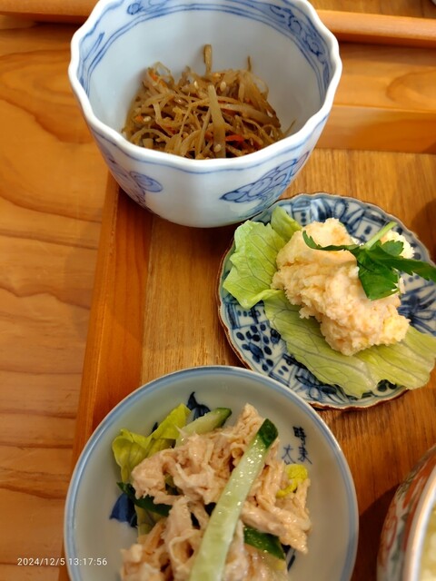 定食は爆弾お肉的な煮込みハンバーグをメインに棒々鶏小鉢、ポテトサラダ小鉢、きんぴらゴボウ小鉢が付き、なめこのお味噌とご飯です