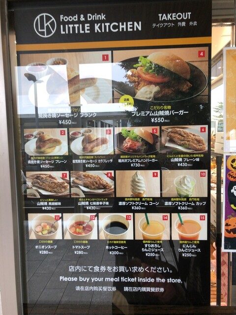 今回は「粗挽き焼ソーセージ フランク」(税込450円)、「軽井沢プレミアムハンバーガー」(税込730円)、「オニオンスープ」(税込280円)、「ホットコーヒー」(税込300円)、「すりおろしりんごジュース」(税込250円)を注文します。