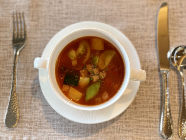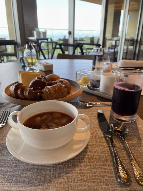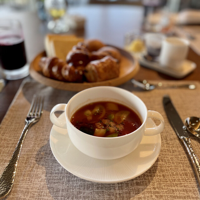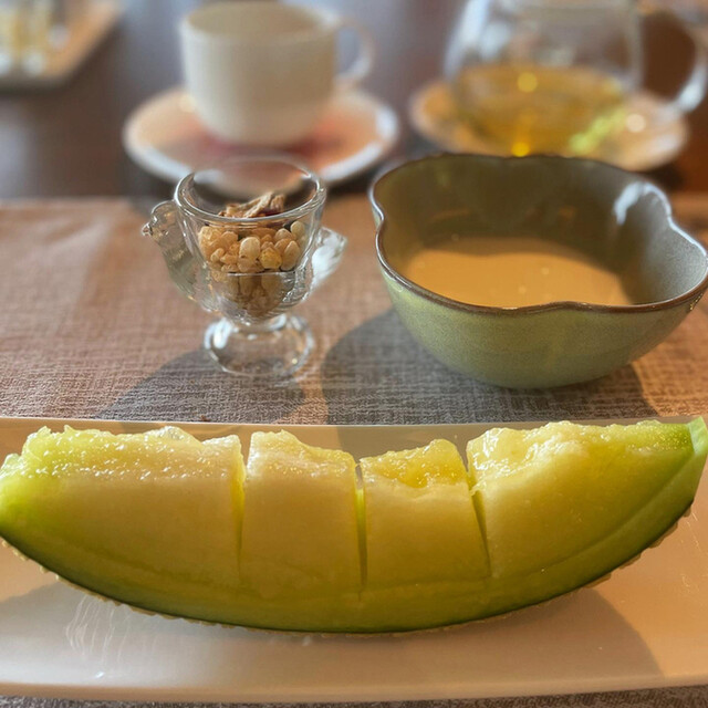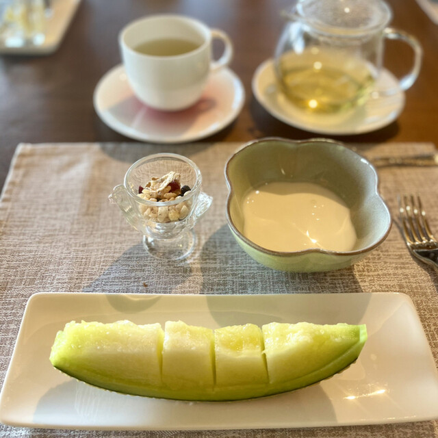 スープから始まり、メインのナス料理やデザートのメロンもとっても美味しく、朝から清々しい空間でいただくモーニングは大満足でした!