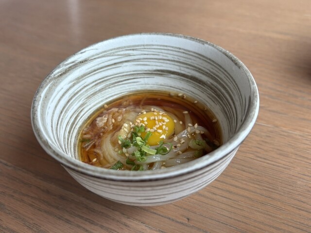 先付けの細うどんはツルツル食感で、うずらの卵を絡めると濃厚な味わいに。