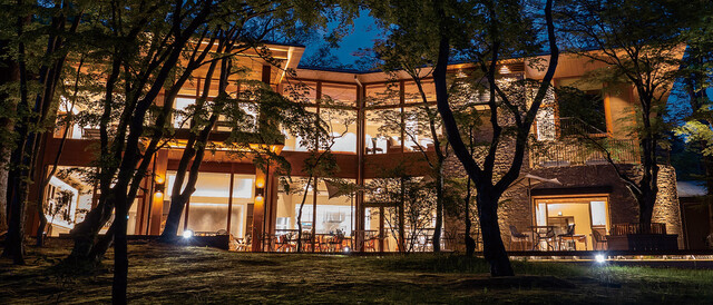 夜の森にやさしく浮かぶ苔庭とレストラン (by お店)