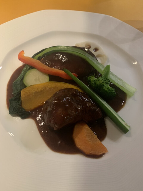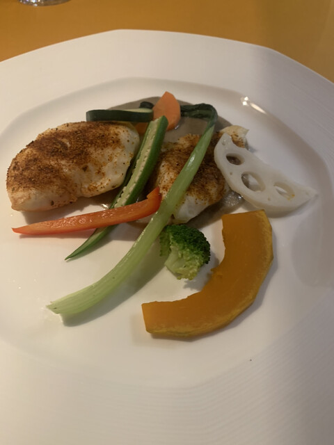 サラダは海鮮系のサラダ、野菜と小エビなどが自家製?ドレッシングとマッチして美味しかった。パスタはクリームソースが濃厚!ベーコンも柔らかく美味しい。パスタは80gとのことで、それは少し足りないかと大盛にした。正解、かな。スープは根菜の入ったコンソメスープ。やさしい味。メインの信州ポークも柔らかく、地元野菜と美味しい。