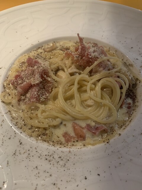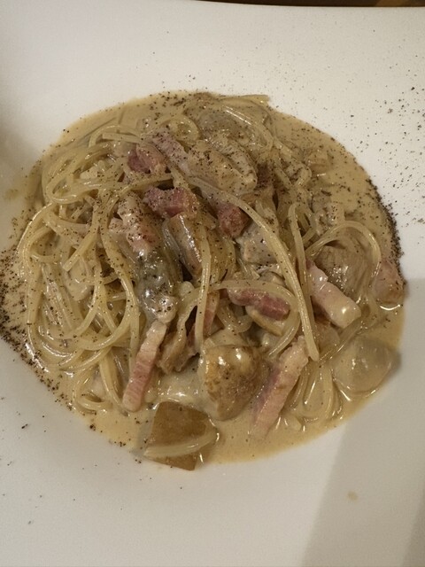 パスタとメインは選択肢があって、私はパスタは、追加料金を出してポルチーニと信州ベーコンパルミジャーノクリームソース、メインは信州ポークのグリルをお願いした。