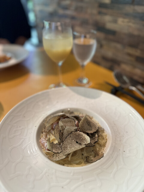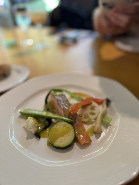 アミューズはサーモンとクリームチーズのバケットのせ。定番でおいしかったです。パスタはメニューが時期によって変わっているようで、私がいただいたのはベーコンのカルボナーラだったかな?トリュフも入った贅沢なパスタでした。トリュフの香りがすごく良くて、ベーコンのしょっぱい感じとよく合いました。お魚は鮭だったのですが、ほろっとした食感と周りの野菜のシャキシャキ感が楽しかったです。色合いもカラフルで、とても素敵な一品でした。お店の方もサービスが行き届いていて、緑あふれる素敵な店内でした。また伺いたいです。