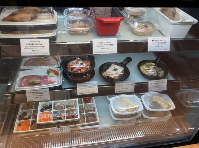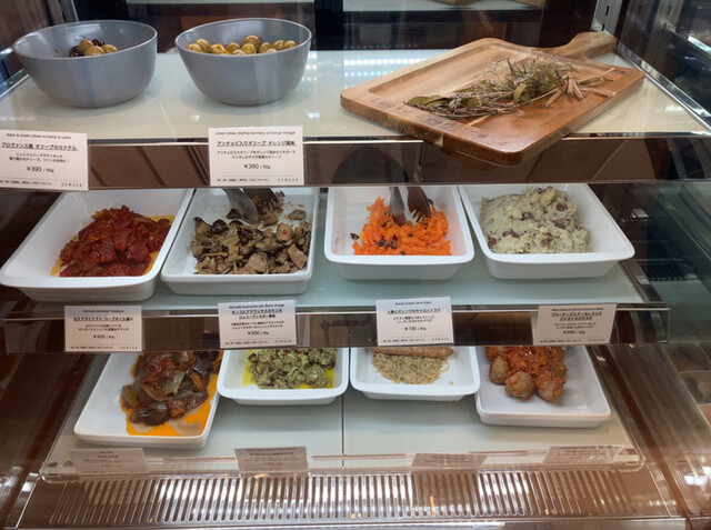 デリ(たぶんキャロットラペ、タコとセロリと大根のサラダ、キノコとアマランサスのマリネです)も