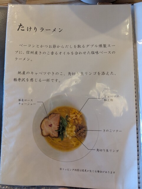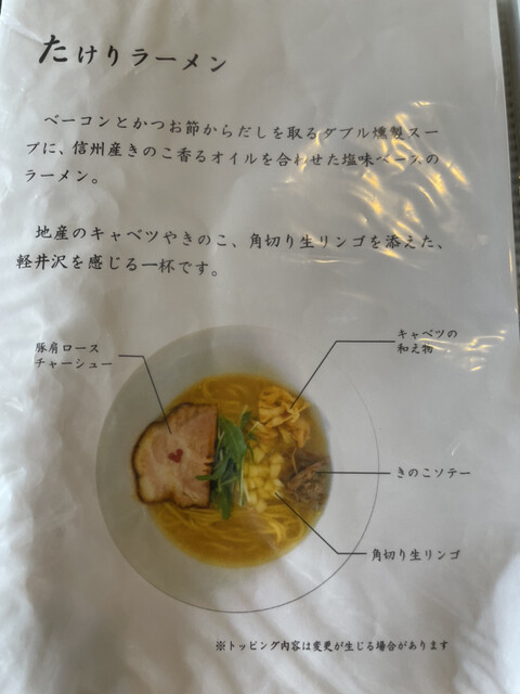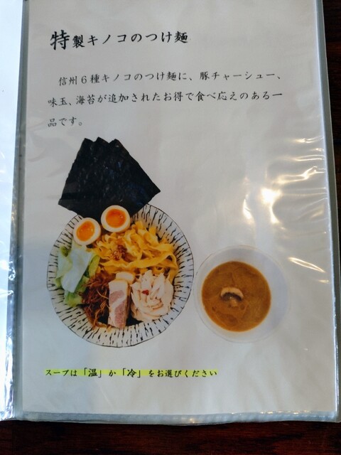 キノコラーメンをいただきました。とっっっても香りが豊かで、シイタケ・マッシュルーム・ポルチーニが入っていると思います!具材もとっても美味しくて、おそらく嬬恋村産のジャッキジャキのキャベツと、脂身がとっ...