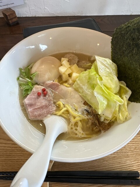 他の方の口コミで、量があまりと書いてあったのですが ライスつければ丁度いい感じでした すごい映えるしラーメンの上に乗っている生リンゴがなかなか良かったです 店内は狭めで、先会計でした