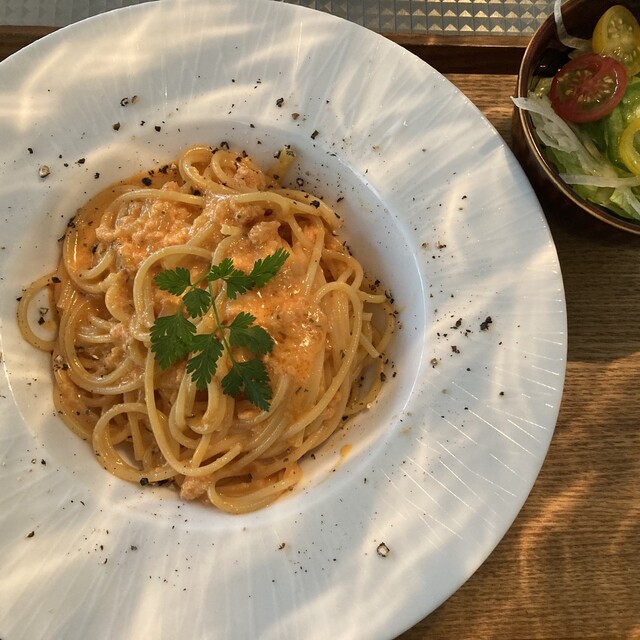 連れの香ばしい香りの良い、アンチョビと春キャベツのパスタ。ドリンクとミニサラダがつきます。スープは¥300プラスで注文。
