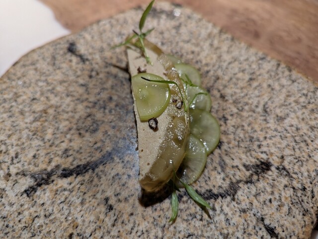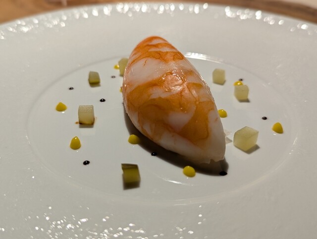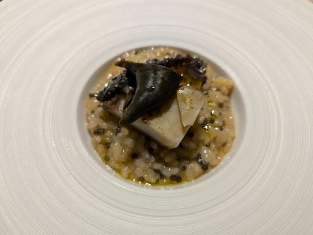 続く足赤海老のバルサミコ酢と古代きゅうりのピクルスは、ソースを目の前で掛けて仕上げる演出もあり、海老の濃厚な旨味が際立つ。風さやか米のリゾットにアワビとキャビアをのせた一皿は、厚みのあるアワビの食感と贅沢な素材感に圧倒された。