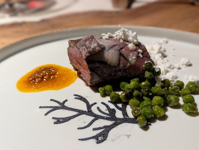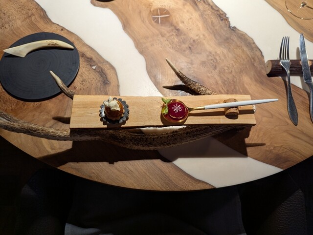 アミューズは鹿の角の上に盛られた遊び心ある一皿。トウモロコシのキャラメルポップコーンやビーツの柚子蜂蜜仕立てなど、季節感と驚きを感じさせる工夫が光る。