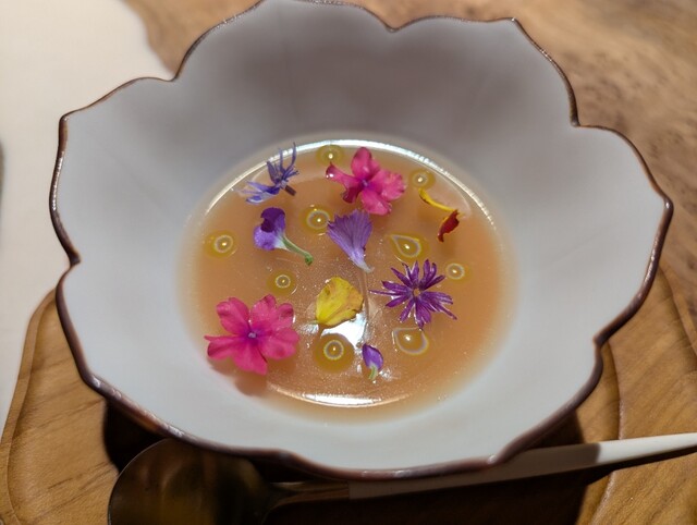 前菜では、フォアグラとシャインマスカット、林檎の組み合わせが絶品。さらに、45℃の低温調理で仕上げた帆立のコンソメ フィンガーライム添えは、出汁をかけて完成させるライブ感があり、上品で複雑な旨味を楽しめた。