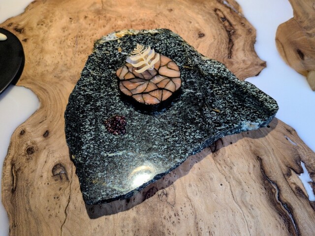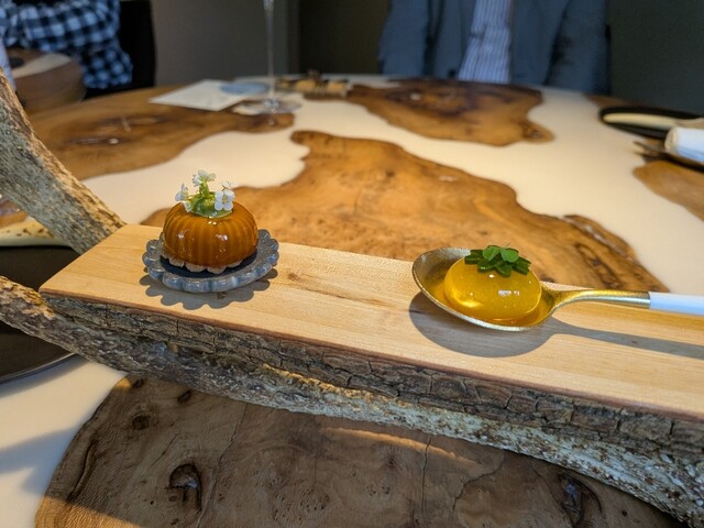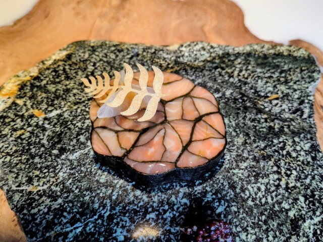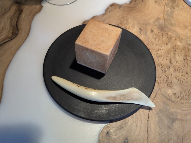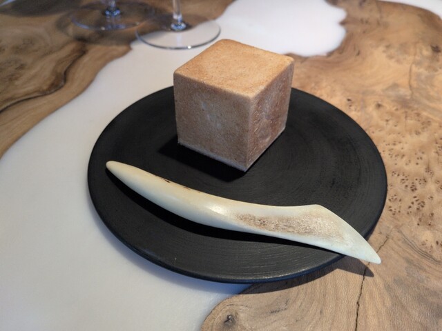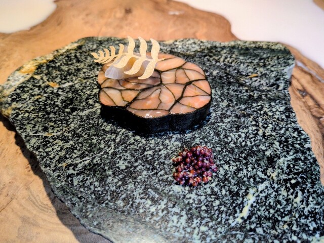 佐久の八千穂漁業さんが、八ヶ岳の流水で育てたサーモンに野沢菜から抽出した出汁を染み込ませ、野沢菜、海苔をモザイクのように重ねたテリーヌ。。