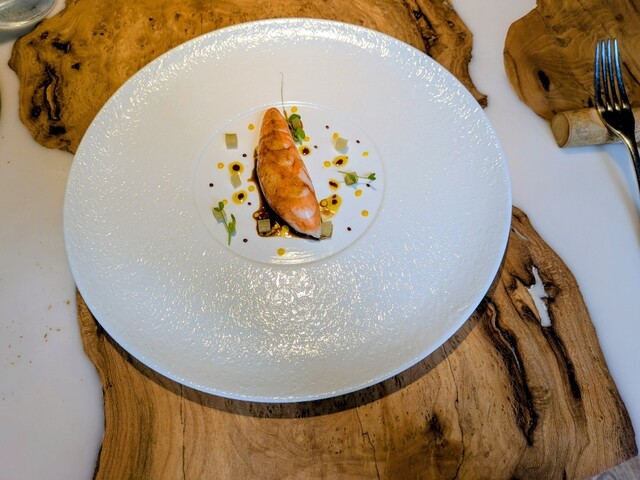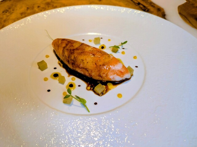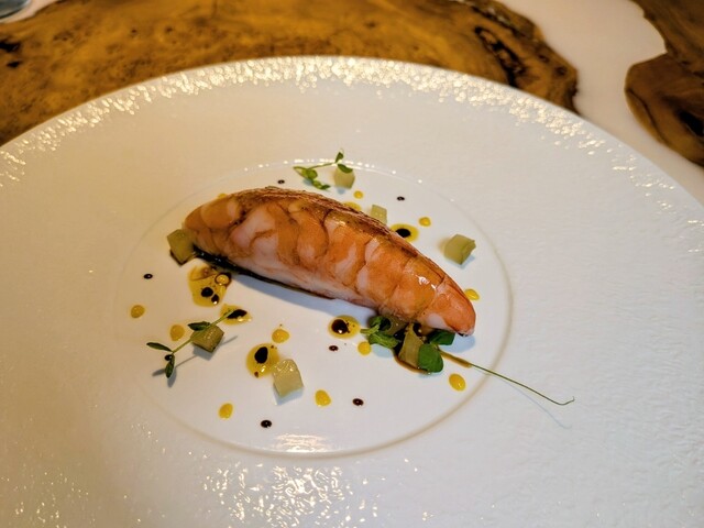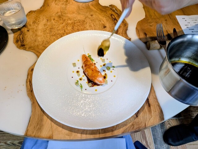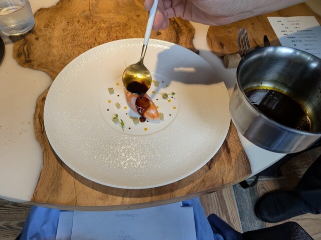 ソースは長野バルサミコとオリーブオイルのソース、ターメリックソース、凝縮させた海老味噌のソース。