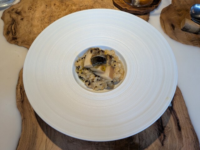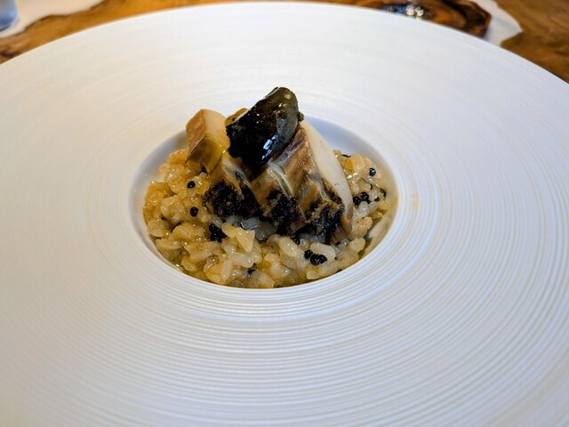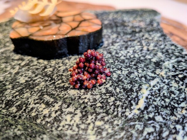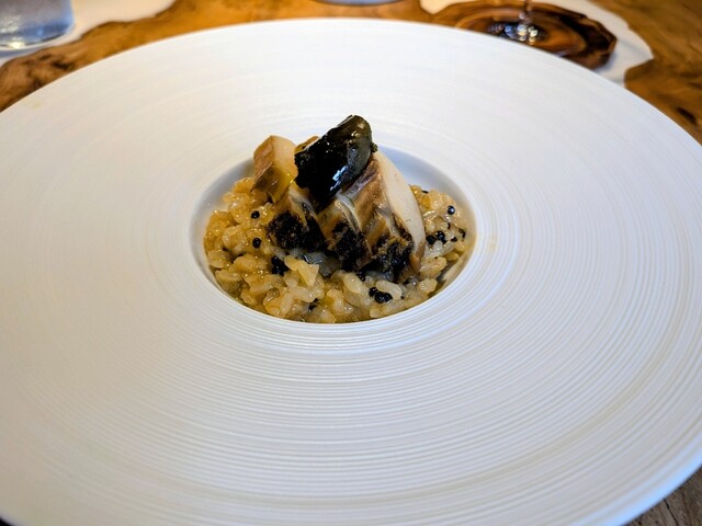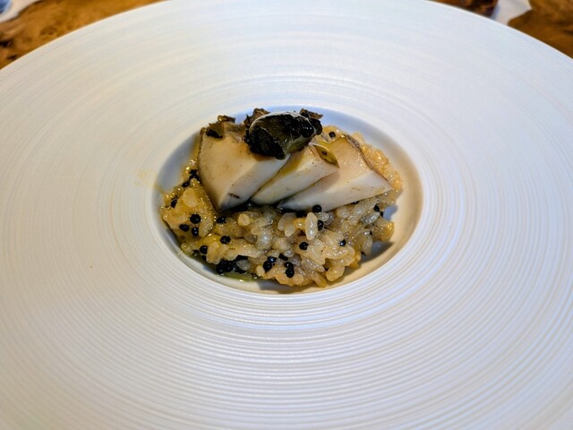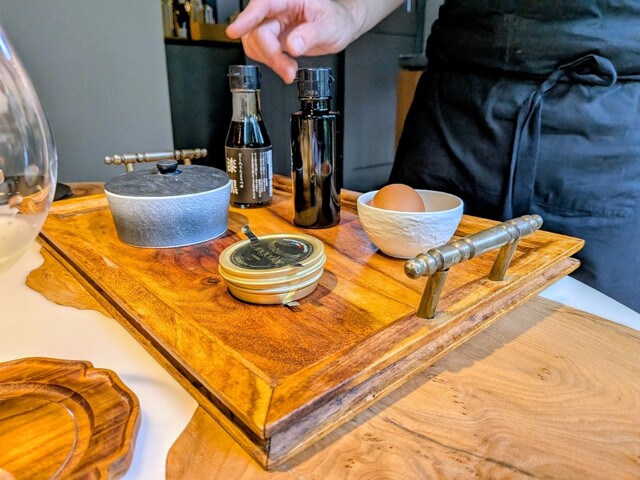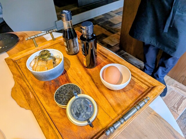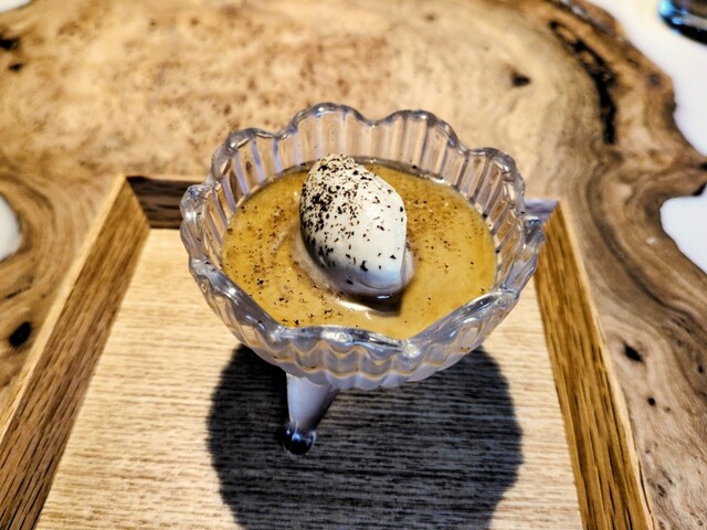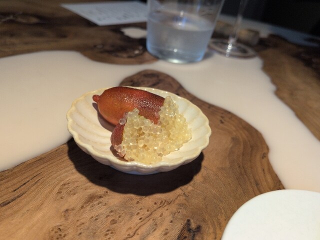 岐阜の醤油“漆黒”、広島江田島の世界一のオリーブオイル『安芸の島の実』、卵、オシェトラキャビア、愛媛今治の赤鮑の白ワイン蒸しを添えて。肝のソースをトッピング。