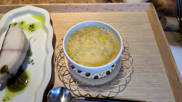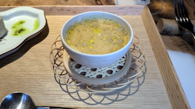 安曇野の天然水、ゲランドの塩、キノコ、カツオ、昆布、韃靼そば茶のコンソメスープ。