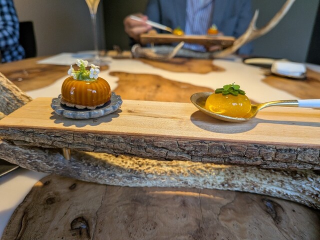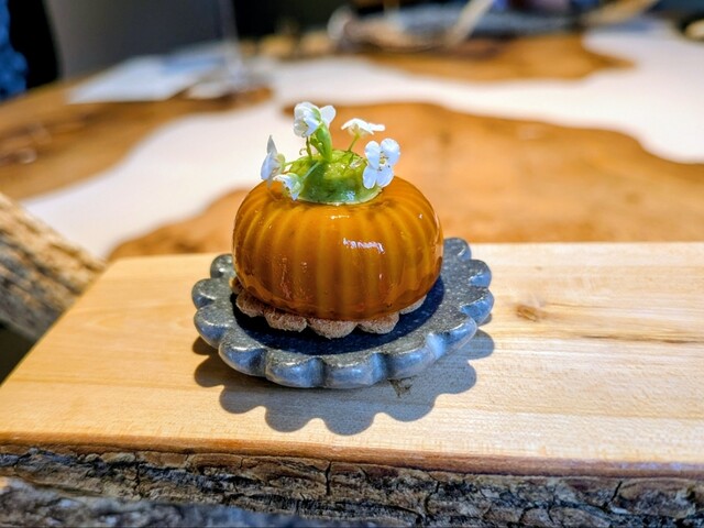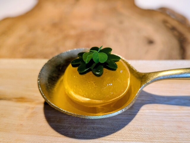信州アカシヤの蜂蜜に漬けた柿、柚子、柿の酢のボンボン仕立て。下にはハムのジュレ上はカタバミ、オキサリスの葉。