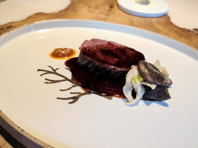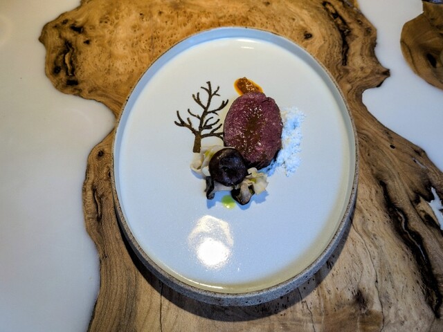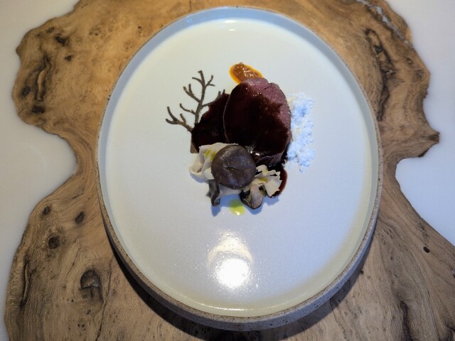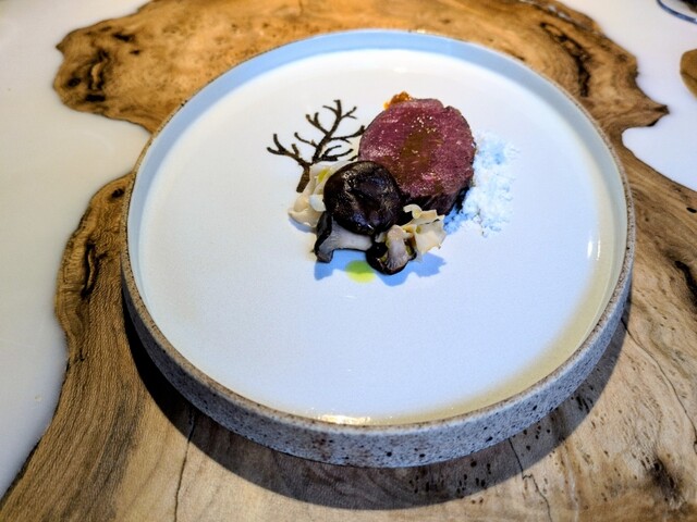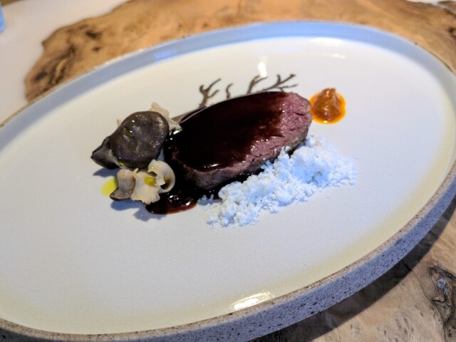 北海道蝦夷鹿のロース肉のグリエ。信州平茸、花びら茸、アボカドのオリーブオイルにんにく炒めを添えて。