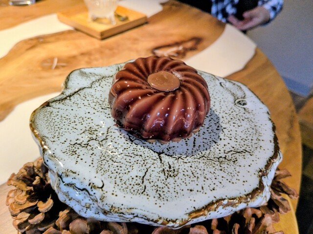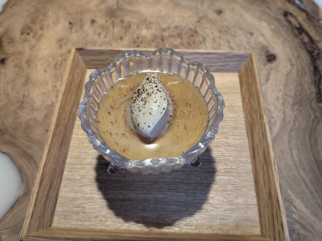 信州産きのこの出汁、骨の出汁で仕上げたフラン仕立て。