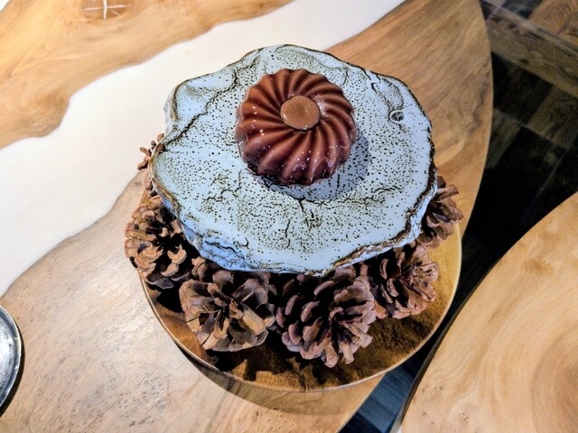中は、栗のムース、ベークドチーズ、長野パープルのジュレ。フランス産有機チョコレートのディオチョコレートをパウダー状にして。まわりは長野生パープルでコーティング。