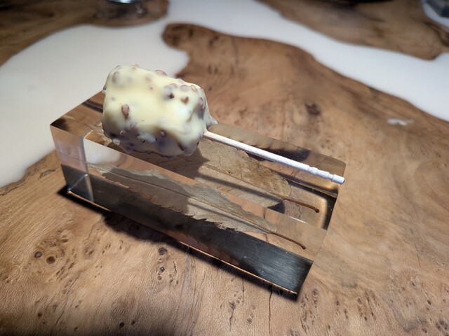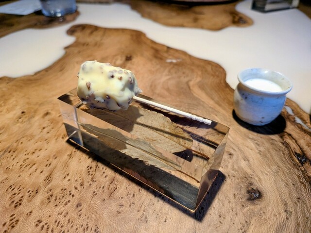 マシュマロをホワイトチョコレートでコーティング、長野蕎麦の実をあしらって。