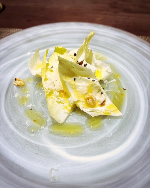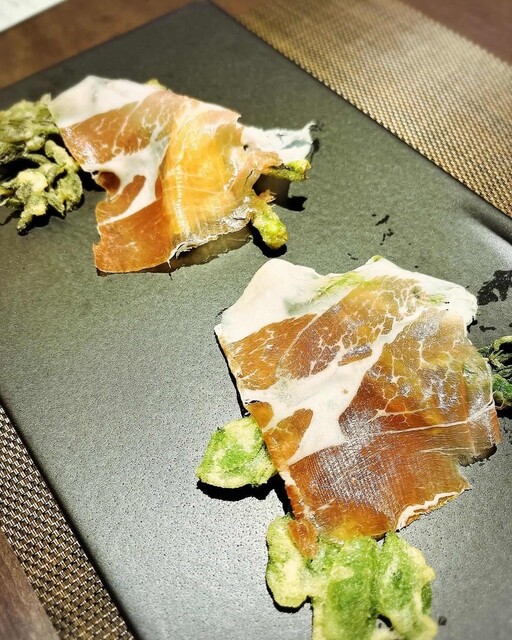 前菜では山菜と春野菜のフリットに生ハムを合わせてあり、フリットの熱で生ハムの脂がほど良く融けて美味しく仕上がっています。
