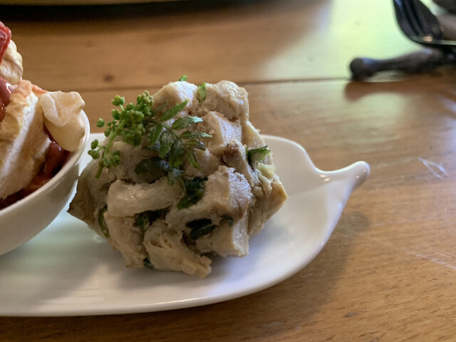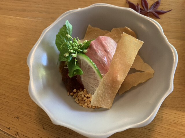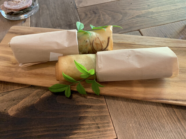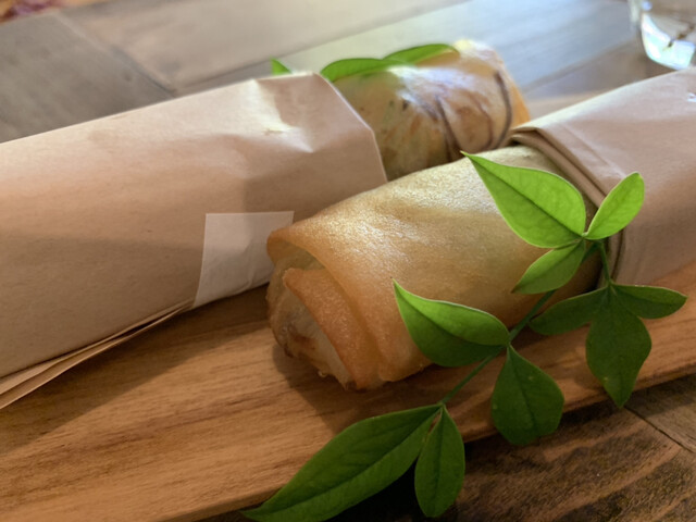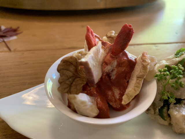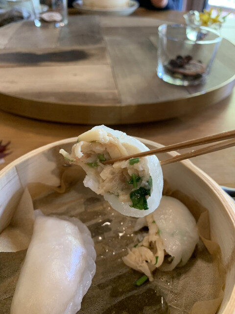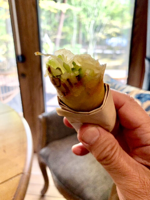 「ビタミン大根春巻き」…ビタミン大根(青大根、青長大根とも呼ばれている)は元々中国で作られていた大根らしい。シンプルだけど、皮もサクサクに揚げられ爽やかな春巻に仕上げられている。味付け代官山でケータリング中心だったお店が軽井沢へ「アフタヌーンティー飲茶」をテーマに引っ越してきた。