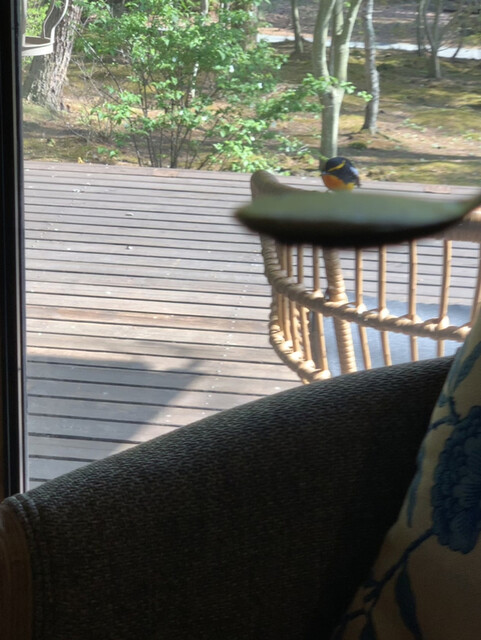 僕ら以外では時々、色んな小鳥がやってくる。色のキレイな小鳥は、キビタキと言う『森のナルシスト』と呼ばれる小鳥。夏の始めに森を訪れるとか。こんな気持ち良い空間の中で数時間食事を楽しむのは贅沢な話。