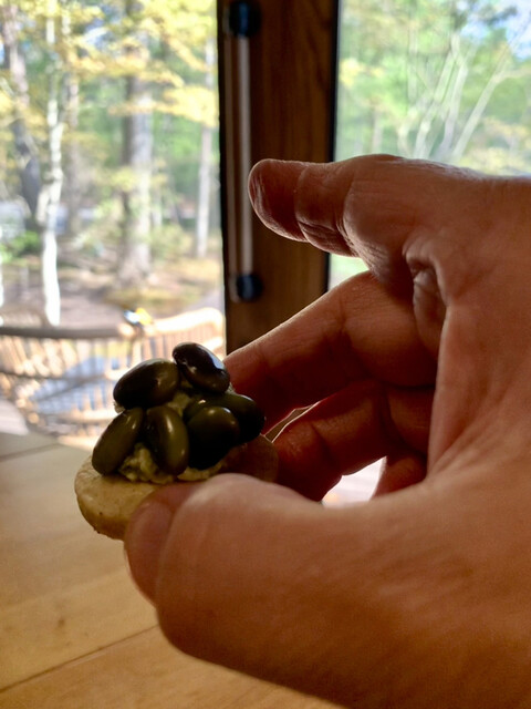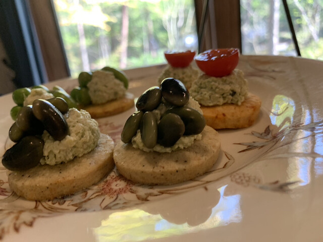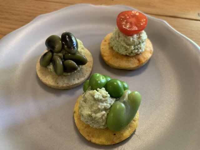 鞍掛豆、ミニトマト、空豆が乗った少し塩気のあるクッキー生地のお菓子