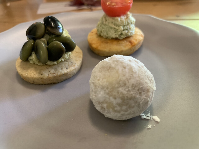 続いて、アフタヌーンティーケーキスタンドの上段には鞍掛豆、ミニトマト、空豆が乗った少し塩気のあるクッキー生地のお菓子。