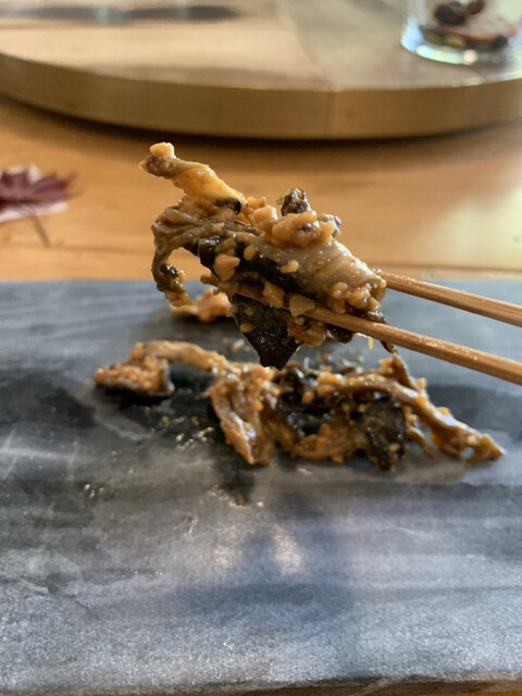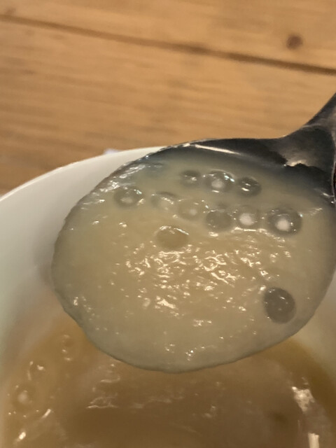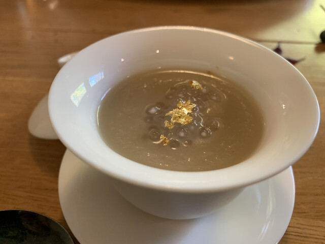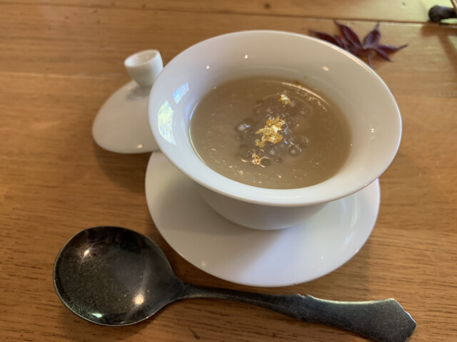 そして最初の料理は「菊芋の擦り流し」…胃にも優しく温かでとろみがある。味付けも上品に仕上げられていて、タピオカも入り食感変化が楽しめる一品。さらにほっと出来る料理。