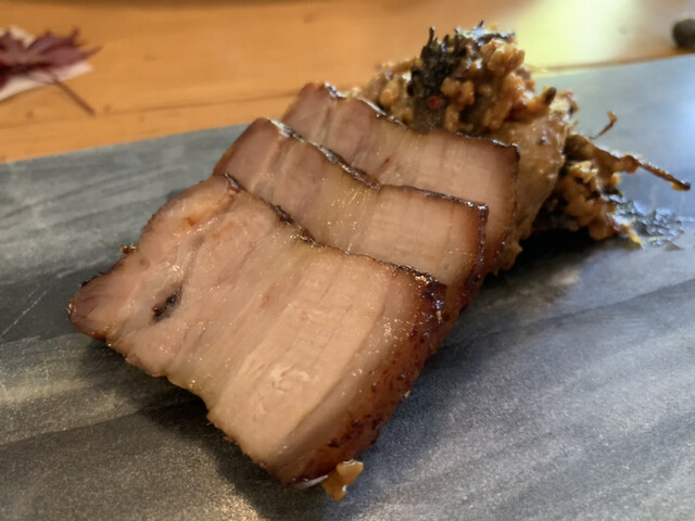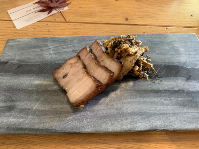 「ポークチャーシュー、キノコと胡桃の和物添え」…脂身も美味いチャーシュー。