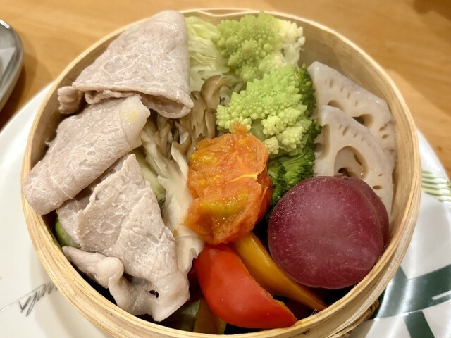 メニューは少し変わっていて、1番食べたかった軽井沢野菜のバーニャカウダがなく、新しく野菜のせいろ蒸しバーニャカウダソースを注文。