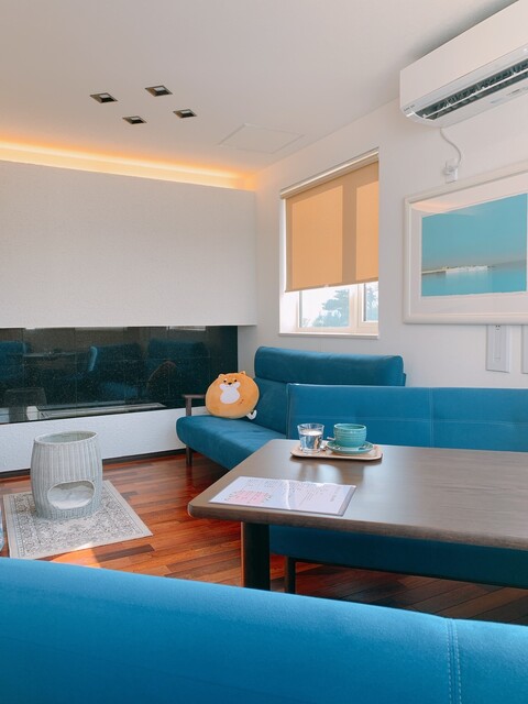 店内に入ると青いソファーが素敵で時々オーナーが飼われているわんちゃんとねこちゃんがお店に非常勤で遊びに来てくれます。人懐こいわんちゃんねこちゃんに会えればラッキーです。