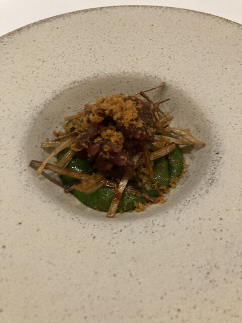 ●牛肉と春菊、ポルティーニ、カラスミ、玄米