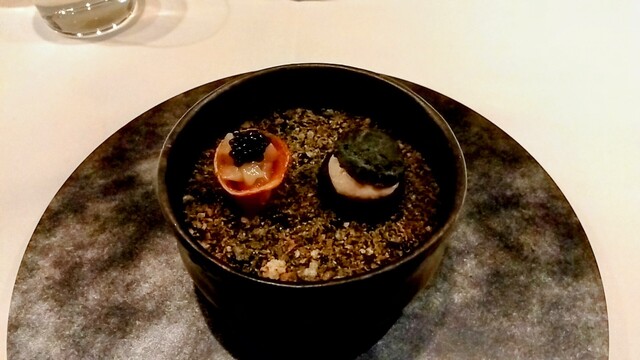 湯河原の飛騨柑橘農園の温州みかんのペーストにグランマルニエの古い年代物とフレッシュの2種を使い、ゼリー状にして。その中には、松の実のクランブル、マンゴーとエルダ―フラワーのムースグラッセ。真っ黒に焼いたみかんとコーヒーのガナッシュ。トッピングにはマリーゴールドとサラダバーネット(ハーブ)を添えて。