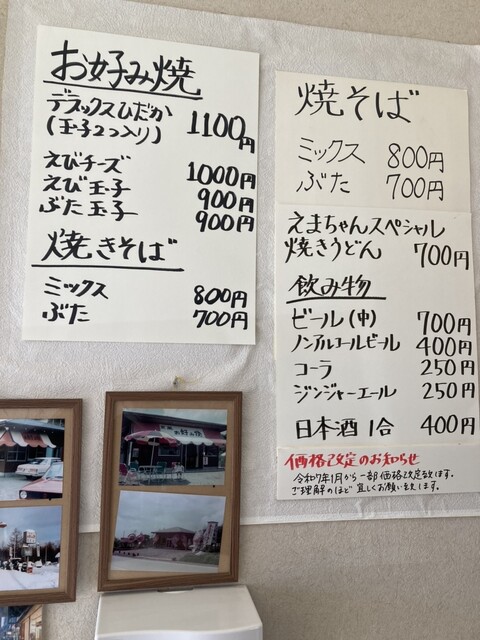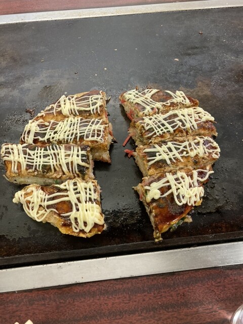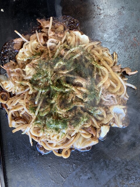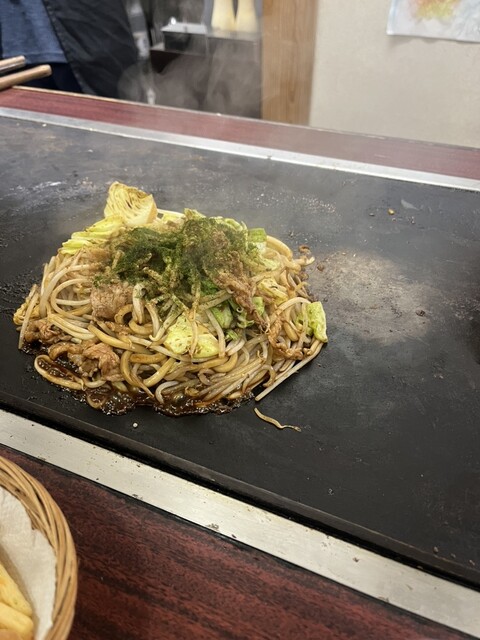 夜に来店。お客さんはゼロ。入店するとお通しのような感覚でお菓子が出てくる。その後注文したお好み焼きや焼きそばなど目の前で焼いてくれる。お好み焼きの写真は撮り忘れてしまったが焼きそばは味も薄すぎず濃すぎずでちょうどいい味。田舎のお好み焼き屋さんと言ったようなところ。1人初見では入りにくいお店と感じた。